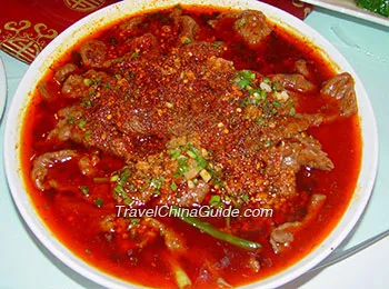 Boiled Pork Slices is a representative Sichuan food as well as one of best Chinese pork dishes. Marinate pork slices with starch, egg liquid, salt and cooking wine. Deep-fry peppers and dry chili to be golden and then ground them. Then, heat some oil, add shallots, sliced ginger and spicy thick-bean sauce, soy sauce, pepper powder and cooking wine. When it smells, add some water. When it boils, add starched pork slices to boil to well-done. Afterwards, move them into a bowl, sprinkle ground fried peppers and dry chili and pour some hot oil.