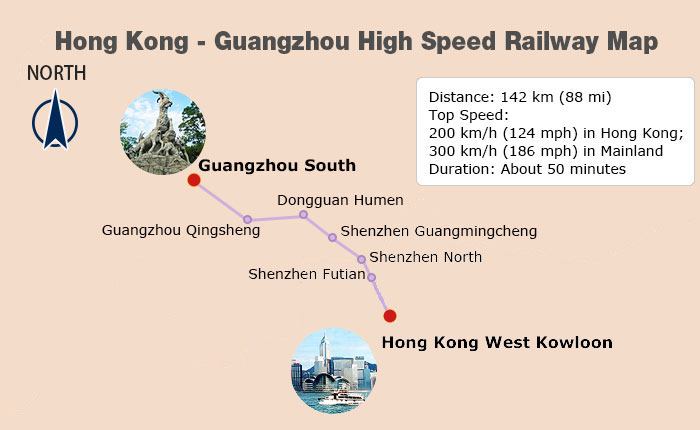 Guangzhou-Shenzhen-Hong Kong High Speed Railway has a whole distance of about 142 km (88 mi). 5 stations are along the line, Qingsheng, Humen, Guangmingcheng, Shenzhen North and Futian respectively. The bullet trains are named as Vibrant Express and they run at a speed of 200 km/h (124 mph) in Hong Kong and at a speed of 300 km/h (187 mph) in mainland of China. Besides, there is free Wi-Fi covering the whole carriages of bullet trains.