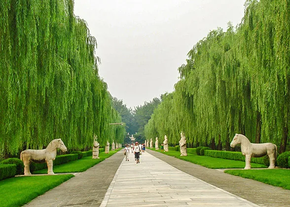 Among the many Sacred Ways, the one of Ming Tombs' is best preserved and complete. The Sacred Way starts with a huge stone memorial archway lying at the front of the area. Constructed in 1540, during the Ming Dynasty, this archway is the earliest and biggest stone archway existing in China today. Farther in, the Shengong Shengde Stele Pavilion can be seen. Inside it, there lies a 50-ton tortoise carrying a stone tablet. A white marble Huabiao (ornamental pillar) is positioned at each corner of the stele pavilion. At the top of each is stationed a mythical beast facing either inward or outward, expressing hope that the emperor will neither cling to the palace nor forget to return to the Palace to handle state affairs. Then come two Roof Pillars on each side of the road, whose surfaces are carved with the cloud design, and tops are shaped like a rounded cylinder. After the 18 pairs of stone statues which are all sculpted from whole stones, and larger than life size, comes the Dragon and Phoenix Gate.